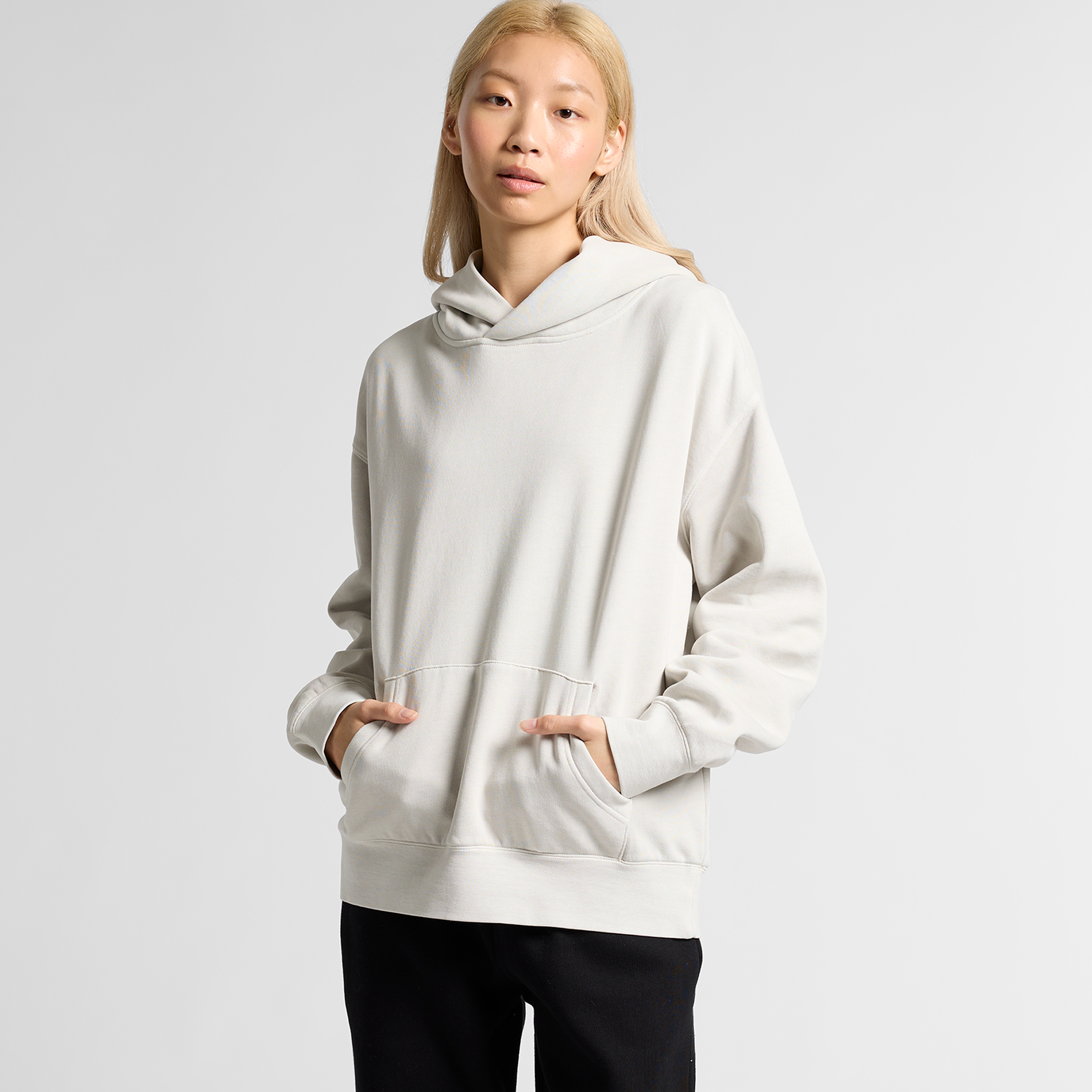 Pullover hood, drop shoulder, kangaroo pocket, self-fabric lined hood, no drawcord, garment dyed, sleeve cuff ribbing