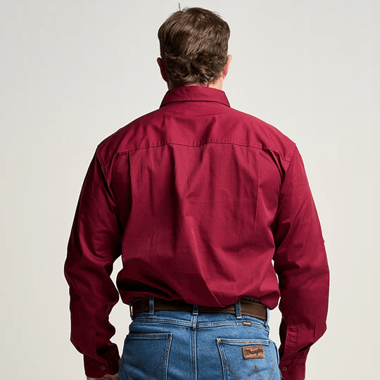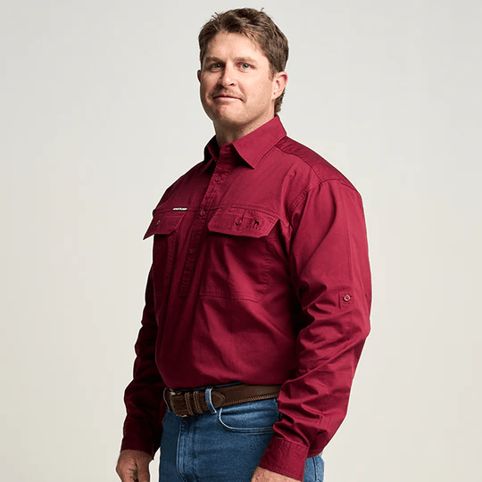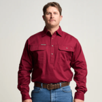 OBCMWS001-BUR KILCOY | Mens Half Button Long Sleeve Work Shirt - Burgundy